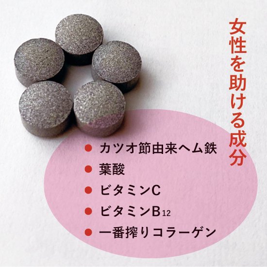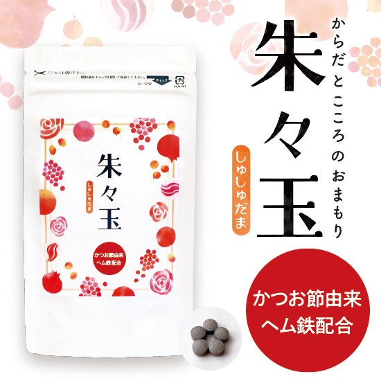 朱々玉は国産かつお節ヘム鉄に加えて、毎日忙しい女性の味方になってくれる成分がたっぷり。 国産かつお節ヘム鉄を中心に、鉄分の吸収を助けるというビタミンCや 女性に大切な成分ビタミンB12・葉酸なども含まれています。 さらに美容面もしっかりサポートする希少な一番搾りコラーゲンも凝縮。 朱々玉は、あなたの体と心のおまもりになってくれます。
